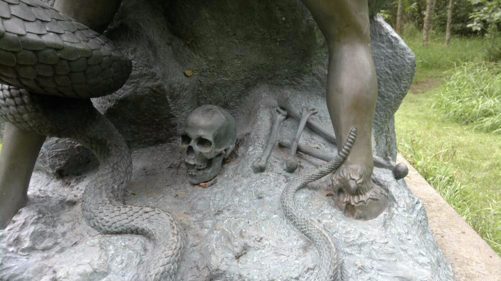 Человек, который сам себя рассекает мечом. Эта скульптура напоминает о самоуничтожении, которое следует из отказа посвящения себя жизненной цели.